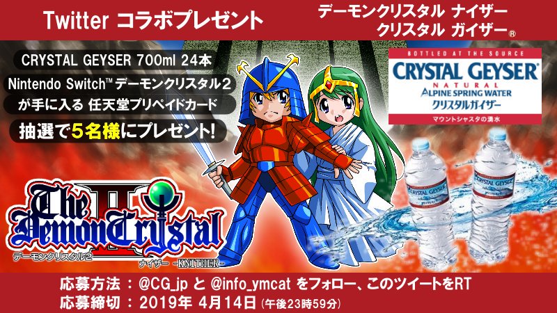 応募者の中から抽選で、クリスタルガイザー700mL24本とデーモンクリスタル2ナイザーが手に入るニンテンドープリペイドカードをセットにして5名様にプレゼント。4月14日までです。
