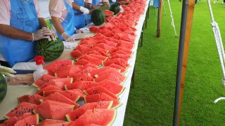 上の写真はスタッフさんが一生懸命すいかを切る所。