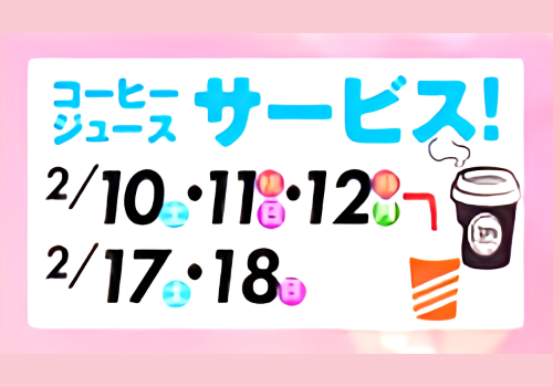 2月10日 (土)・11日 (日・祝)・12日 (月・振替休日)・17日 (土)・18日 (日)の5日間、コーヒーとジュースのサービスがあります。