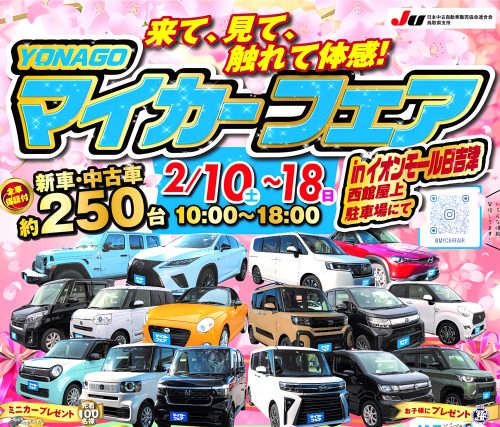 2024年2月10日 (土)~18日 (日)の 9日間、「来て、見て、触れて体感!YONAGOマイカーフェア INイオンモール日吉津」が開催されます。