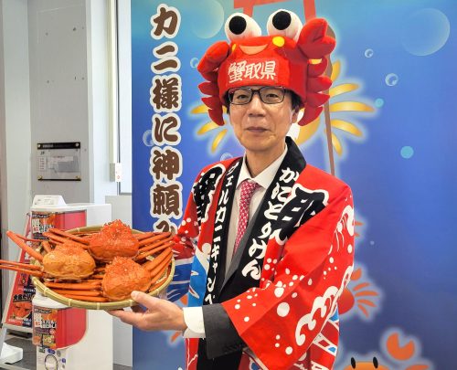 「飛行機を利用されない方にも米子鬼太郎空港に来ていただき、楽しんでいただけたらと思っております。目玉商品は、カニの目利きして20年の丸八水産社長が厳選した紅ズワイガニ。多くの方にカニのご利益があるようお祈りしております。」と米子空港ビル株式会社 代表取締役社長、飯塚弘衛さん。