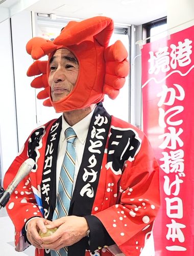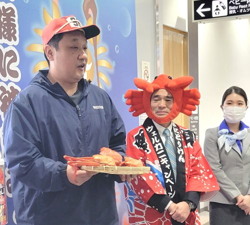 「境港漁港のカニの水揚げ量は日本一!です。境港市民の方にも米子鬼太郎空港に足を運んでいただいて、カニを当ててもらったり、空港テナントで買い物や食事をしたりして楽しんでいただきたいですね。」と話しておられました。