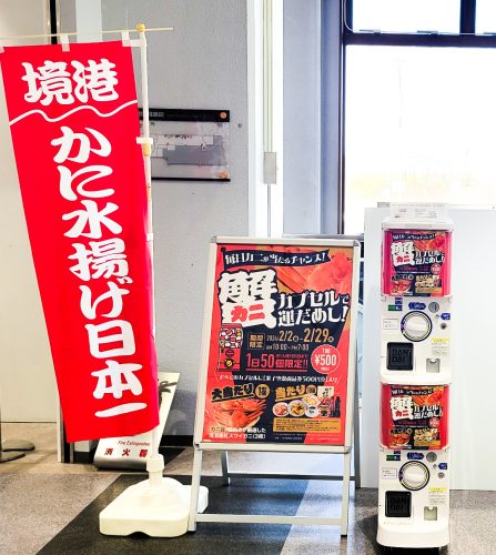 境港市にある米子鬼太郎空港では、2024年2月2日 (金)~2月29日 (木)まで「カニカプセルで運だめし!」が開催中です。