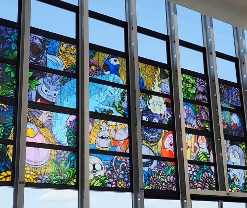 米子空港ビル2階出発フロアの窓一面にある、妖怪を描いた大型ステンドグラス「妖怪たちの森」。圧巻です。