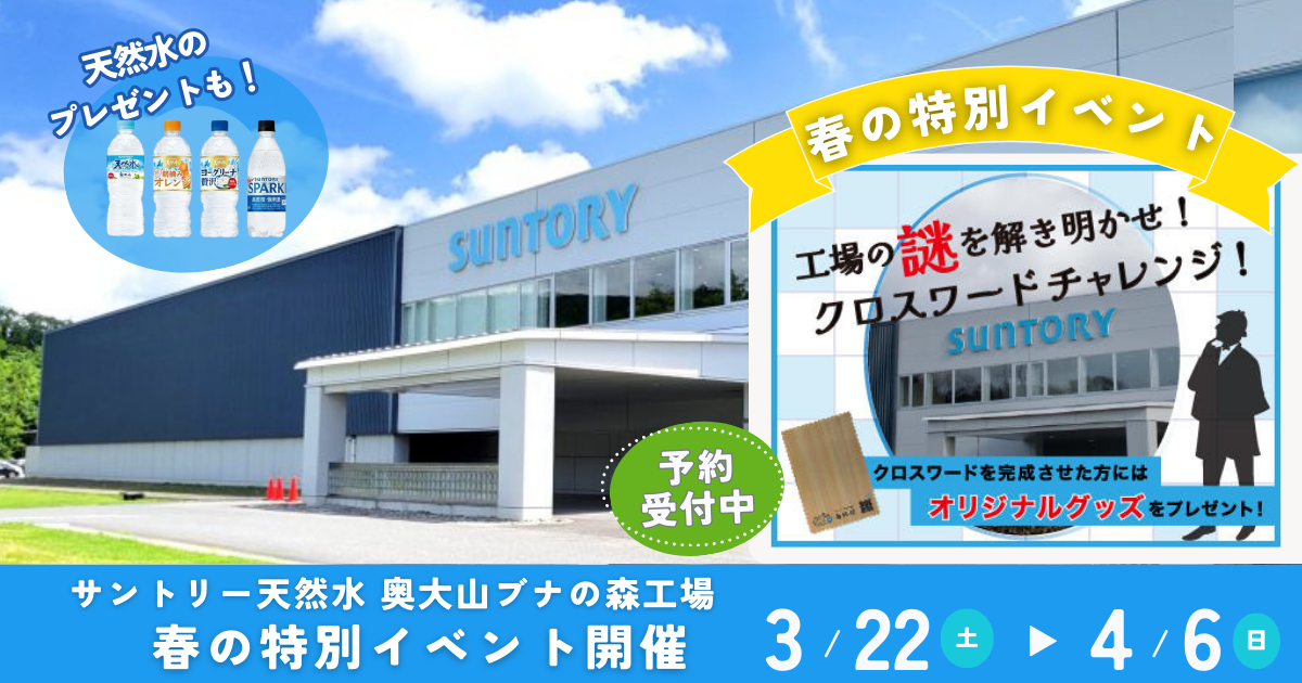 鳥取県日野郡江府町にある「サントリー天然水 奥大山ブナの森工場」で【春の特別イベント】「工場の謎を解き明かせ!クロスワードチャレンジ」が開催されます。