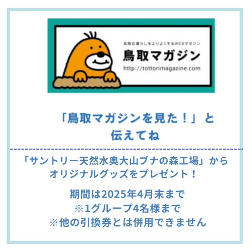 工場見学の際、「鳥取マガジンを見た」と伝えると「サントリー天然水奥大山ブナの森工場」からオリジナルグッズをプレゼント。スタッフの方に「鳥取マガジンを見た」とお伝えください。