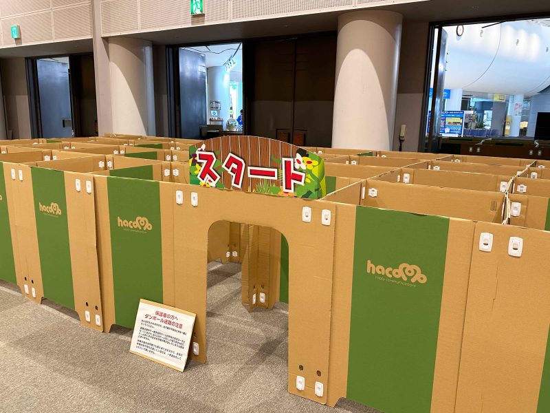 ダンボール迷路は人気アトラクションの一つ。子どもにとっては意外と難しい?保護者の声援をもらって、頑張る子どもたちがかわいいです。
