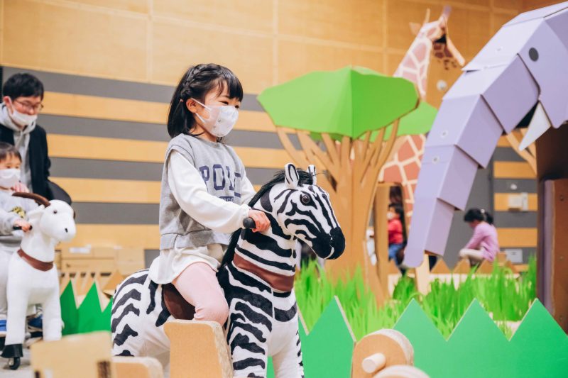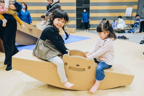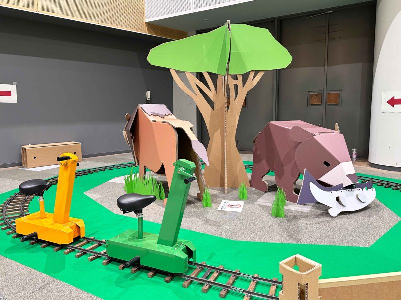 ダンボール製の三輪車や動物の形をした乗り物に乗って、周りを走ることができます。