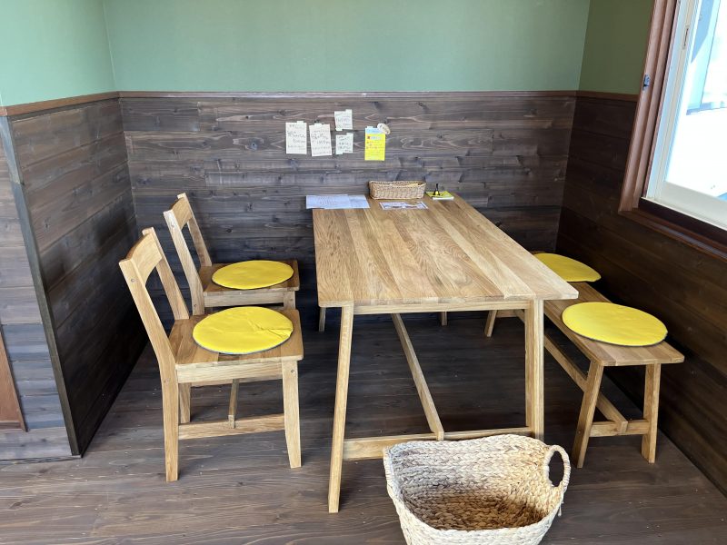 木の温もりがあるテーブルと黄色のクッションが、とってもかわいい♪