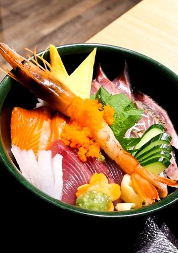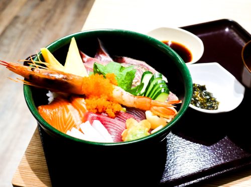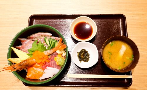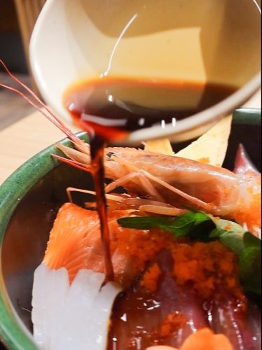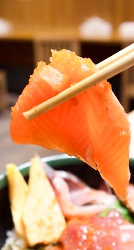 地元で水揚げされた魚介類、地元で養殖されたサーモンを使用した海鮮丼や漬け丼。