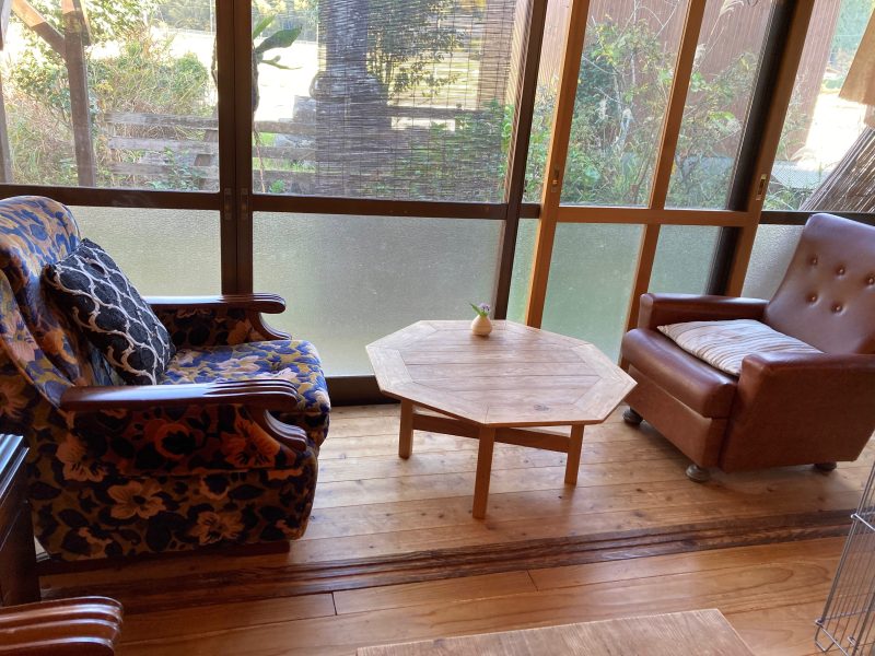 縁側の入口で靴を脱いでから入ります。古民家を改装されているので、味わいのある空間です。