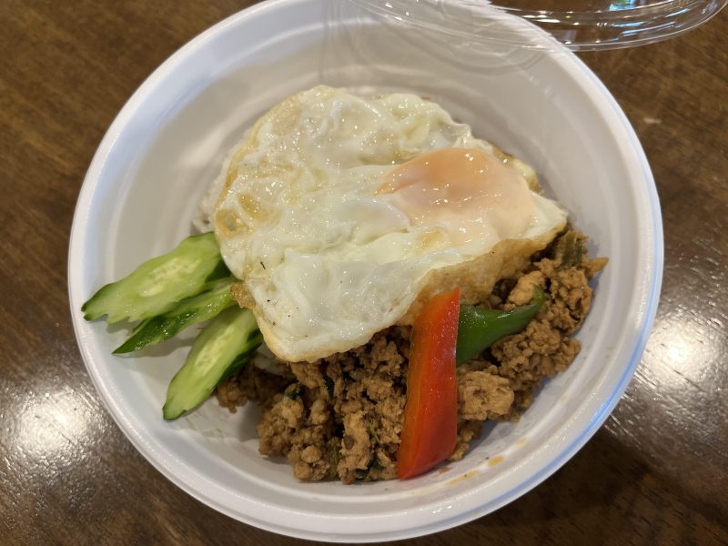 こちらは、「ガパオライス」です。ホーリーバジル(ガパオの葉)と鶏の挽肉を炒め、目玉焼きとトッピング。