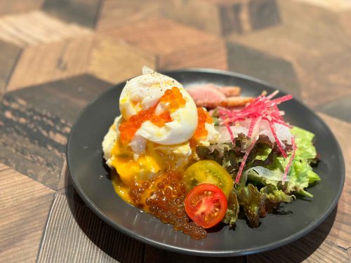 ポテトサラダに半熟卵とイクラ、そして厚切りベーコンも。写真映えもするのでおすすめです。