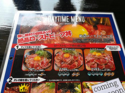 ランチは基本的に、ローストビーフ丼とカレーが中心です。ローストビーフ丼はサイズとタレの味を選ぶことができます。