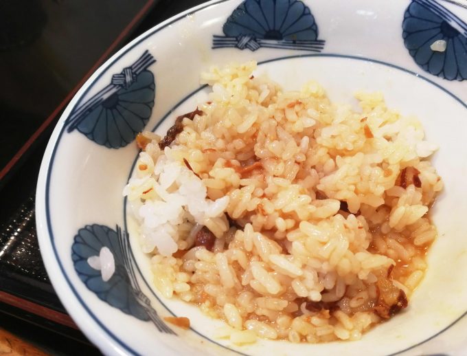 最後に余った牛すじ煮込みのたれを御飯にかけて食べます。