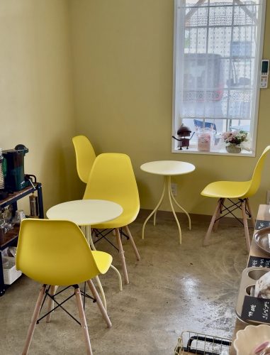 駐車場はお店の前に4台。店内にカフェスペースもあります。