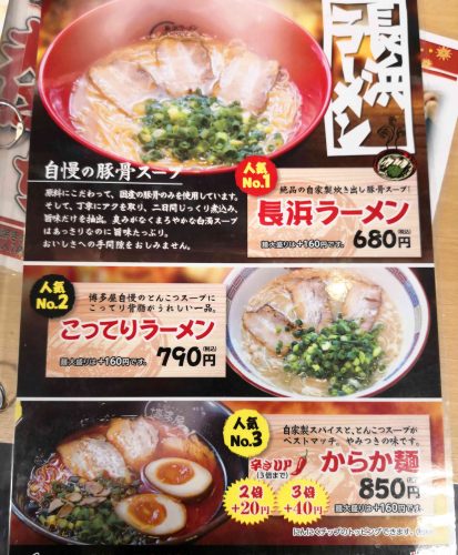 長浜ラーメン、こってりらーめん、からか麺、ネギラーメンの他、ギョーザ定食、からあげ定食などあります。
