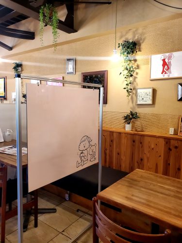 お子様も落書きできるようホワイトボード仕様のパーティションで席同士が区切られています。