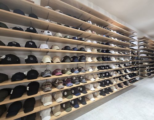 壁一面の棚には、約600アイテムのお洒落な帽子ががずらりと並びます。