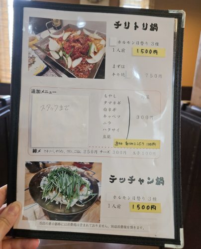 夜は「チリトリ鍋」や「テッチャン鍋」、「やきとん」などのメニューが楽しめます。