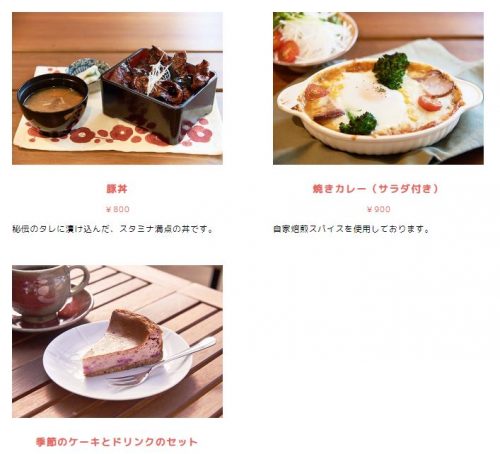メニューの一部は、豚丼、焼きカレー(サラダ付き)、季節のケーキとドリンクのセットなど。