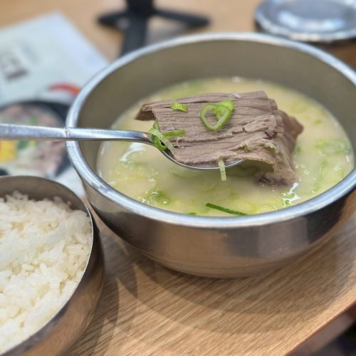 神仙(シンソン)ソルロンタンの「ソルロンタン」 牛骨を24時間じっくり煮込んだ、優しくクリーミーなスープ。辛くないので、朝食や胃を休めたい時にぴったり。キムチと一緒に食べると最高です。