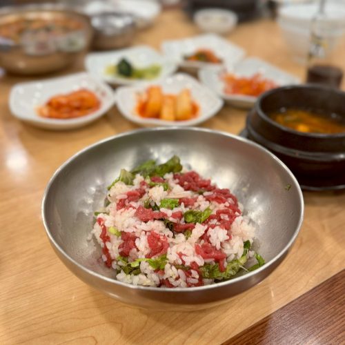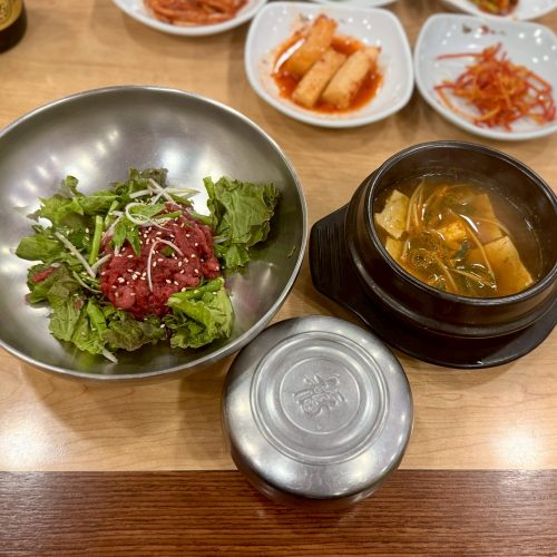 毎朝仕入れる新鮮な韓牛ユッケは、口の中でとろける甘さ。24時間営業なので、夜食にもおすすめです。
