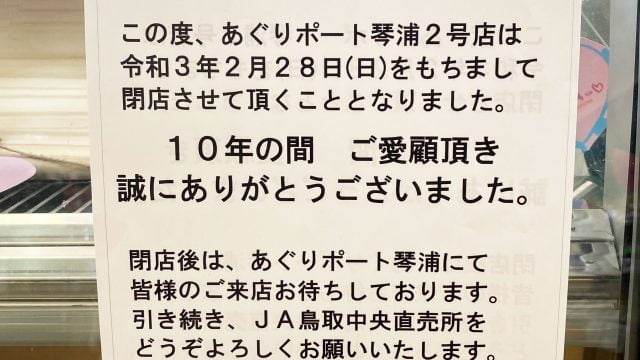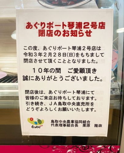 この度、あぐりポート琴浦2号店は令和3年2月28日(日)をもちまして閉店させて頂くこととなりました。〜中略〜