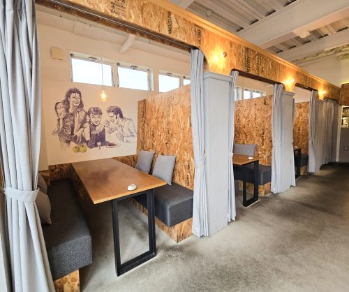 カーテンのある半個室のテーブル席が3つ。