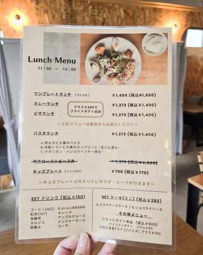 ワンプレートランチ、カレーランチ、ピザランチのほか、3種類から選べるパスタランチ、キッズプレートもあります。