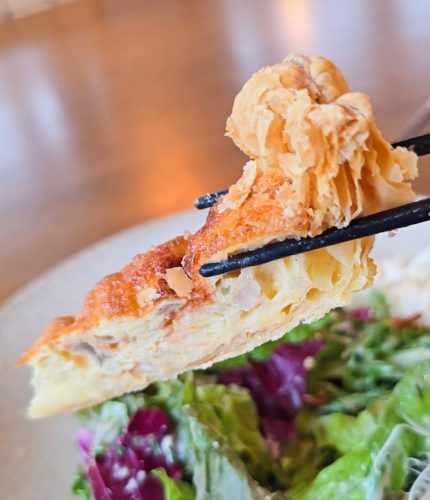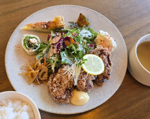 プレートの真ん中にはたっぷりのサラダ、さらにキッシュ、トルティーヤ、きんぴら、カボチャのマリネ、ポテトサラダといった5種類の副菜が並びます。