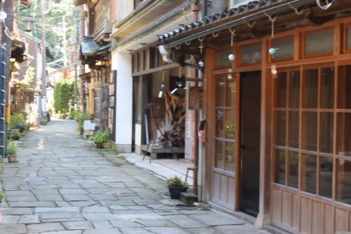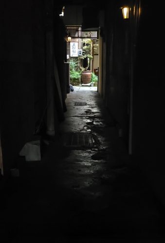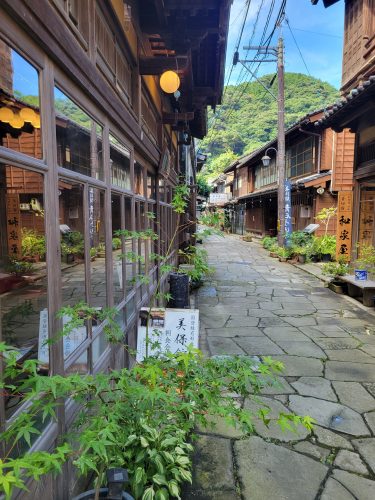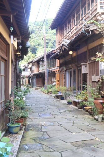 薄暗く細い道ですが、その道を抜けてから見る「青石畳通り」は格別です。