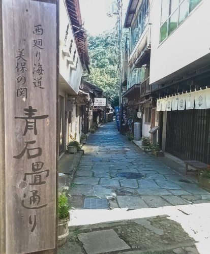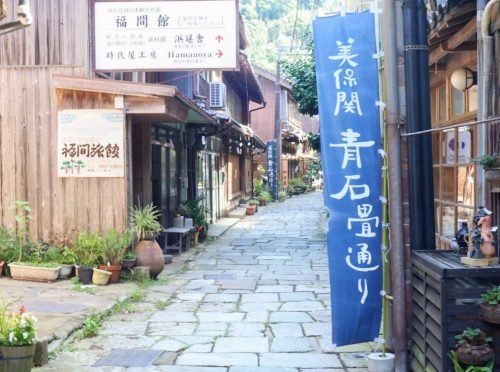江戸時代後期、宿屋を兼ねた問屋が何軒も並び、そこに積み荷を運ぶために石畳が敷き詰められ整備された道が「青石畳通り」です。