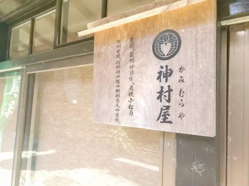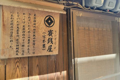 それぞれの家の軒下には、その家の屋号と家紋の入った看板がかけられており、家紋の由来や商売の内容などが書いてあります。