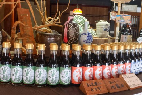 ぽん酢や甘露醤油、つゆなどの地醤油が並ぶ「太鼓醬油店」の店内。