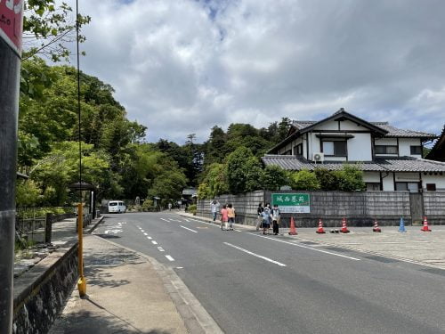 写真の奥の方向に向かって進みます。左側にバス停があります。