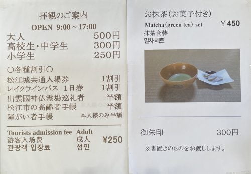 拝観料金はこちら。一般の大人の参拝は500円、高校生、中学生は300円、小学生は250円です。