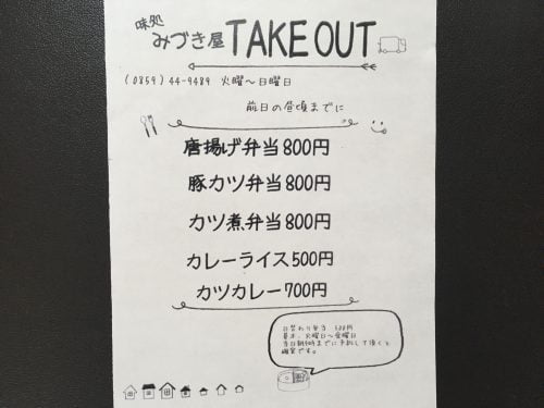 から揚げ弁当、豚カツ弁当、カツ煮弁当、カレーライス、カツカレー(火曜~日曜)、日替わり弁当(火曜~金曜)があります。