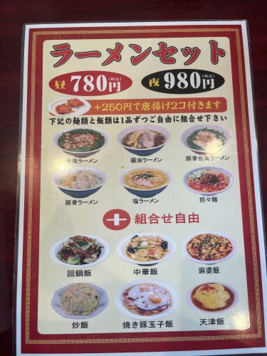 ラーメンとご飯物のセット。昼780円(夜980円)