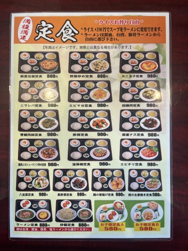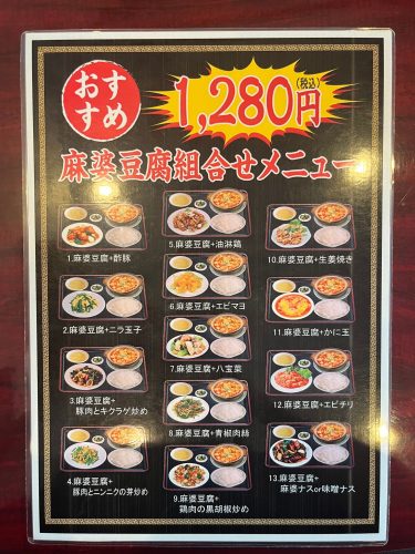 麻婆豆腐がお店のおすすめだそうです。麻婆豆腐・酢豚 1280円、麻婆豆腐・青椒肉絲 1280円 等