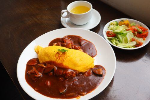 人気NO.1の「本日のオムライスランチ」をオーダー。(サラダ・スープ付)。ふわふわのオムライスとデミグラスソースの相性抜群。