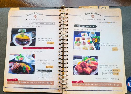 ランチメニューは、週替わりで変わる「本日のオムライスランチ」や「手ごね鉄板ハンバーグランチ」や「MIRAI特製から揚げランチ」などがあります。