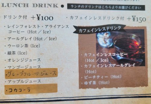 ランチセットに、コーヒーやウーロン茶、アールグレイなどのドリンクを100円で付けることができます。お得ですね。カフェインレスのドリンクもあります。こちらはプラス150円で付けれますよ。