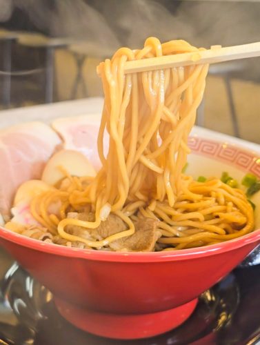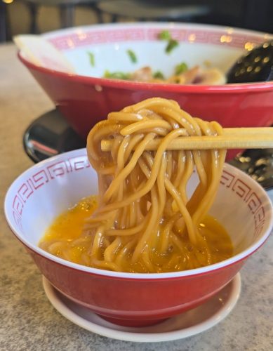 赤い旨辛パウダーが加わることで、牛骨の旨味がさらに引き立ち、パンチのある味わいに仕上がっています。
