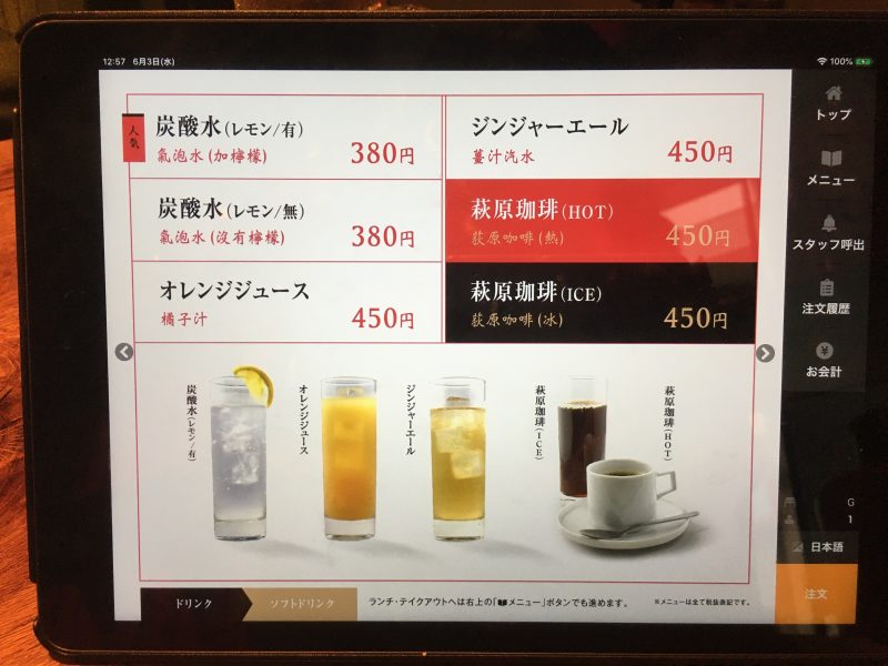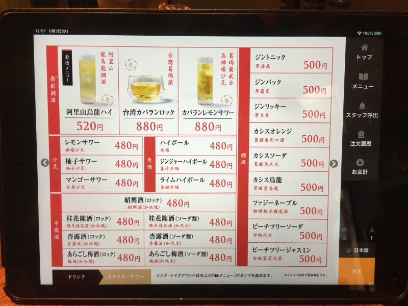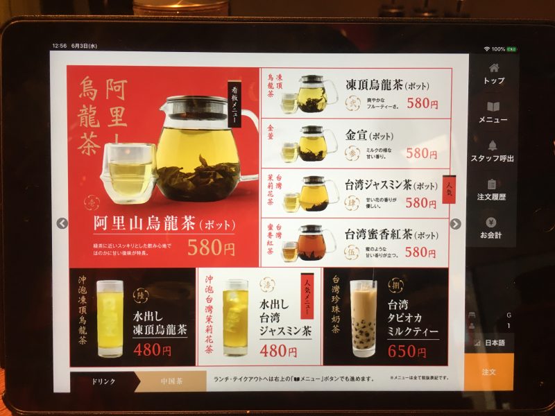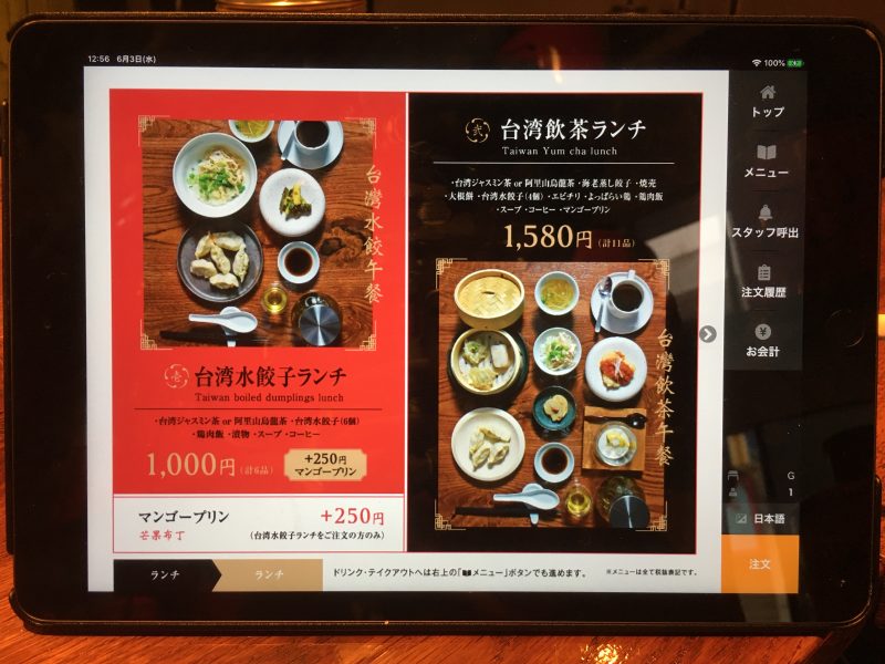 二種類のランチメニューからは台湾水餃子ランチを選択。+250円でマンゴープリンが付くので、迷わず追加しました。タブレットで注文します。
