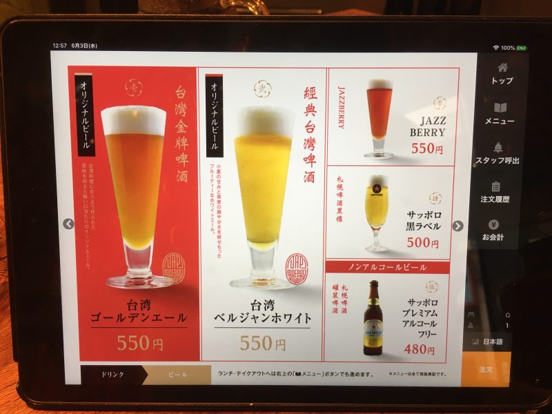 台湾ゴールデンエールというオリジナルビールのほか、サッポロビールもあります。