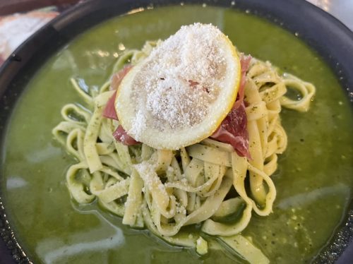せっかくなので季節限定のメニュー「生ハムとバジルのパスタ」を注文しました。