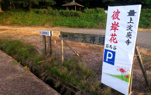 上淀寺廃寺跡では、地元のボランティアの人たちが10年前から毎年5月から6月に彼岸花の球根植栽を行い、現在では約4万球の彼岸花が植えられています。