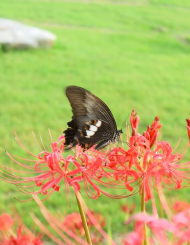 地元のボランティアの人たちが10年前から毎年5月から6月に彼岸花の球根植栽を行い、現在では約4万球の彼岸花が植えられています。