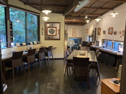 毎月変わるギャラリースペースは、地元や県外の作家さんの作品やご主人が作った木の額・古民具が展示・販売されています。